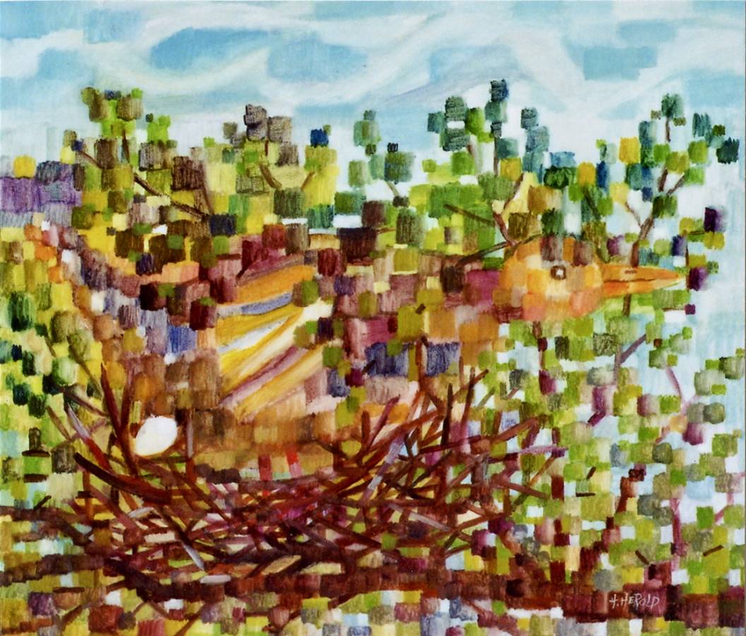 Rhythmischer Vogel, ein Ei legend ˇ Öl auf Leinwand ˇ 60 x 70 cm ˇ 2016