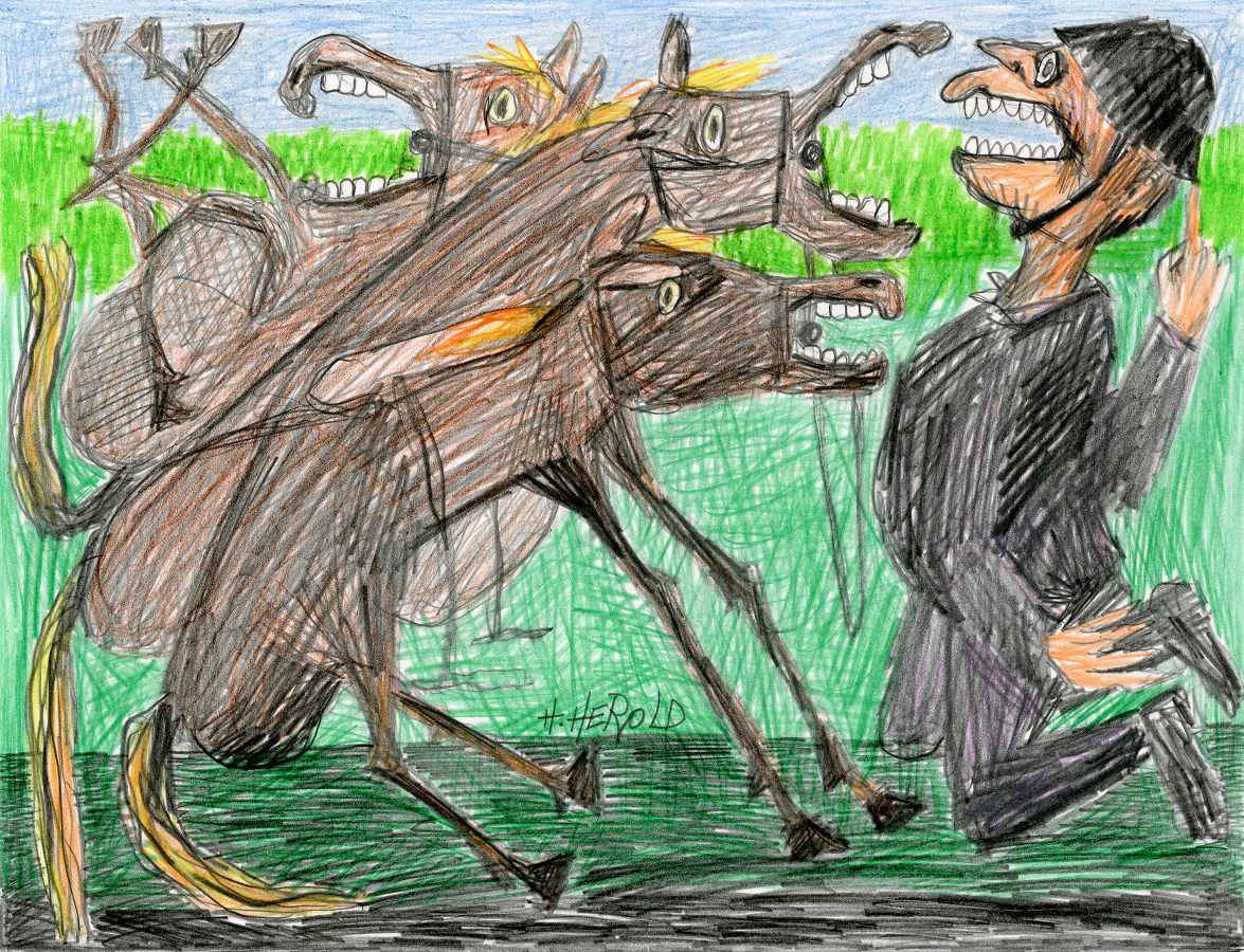 Ein Reiter schimpft mit seinem Pferd · Blei- und Farbstifte · 18,3x23,7cm · 2019