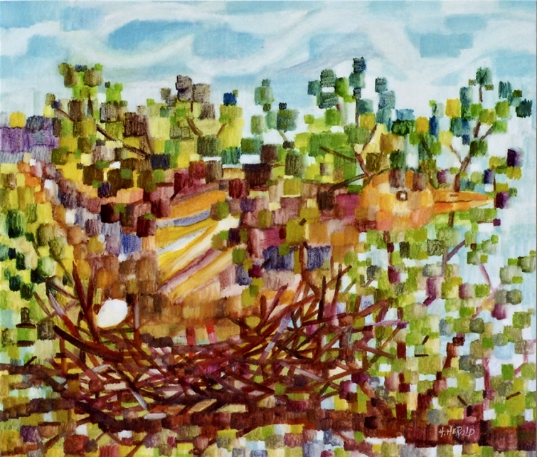 Rhythmischer Vogel, ein Ei legend · Öl auf Leinwand · 60 x 70 cm · 2016