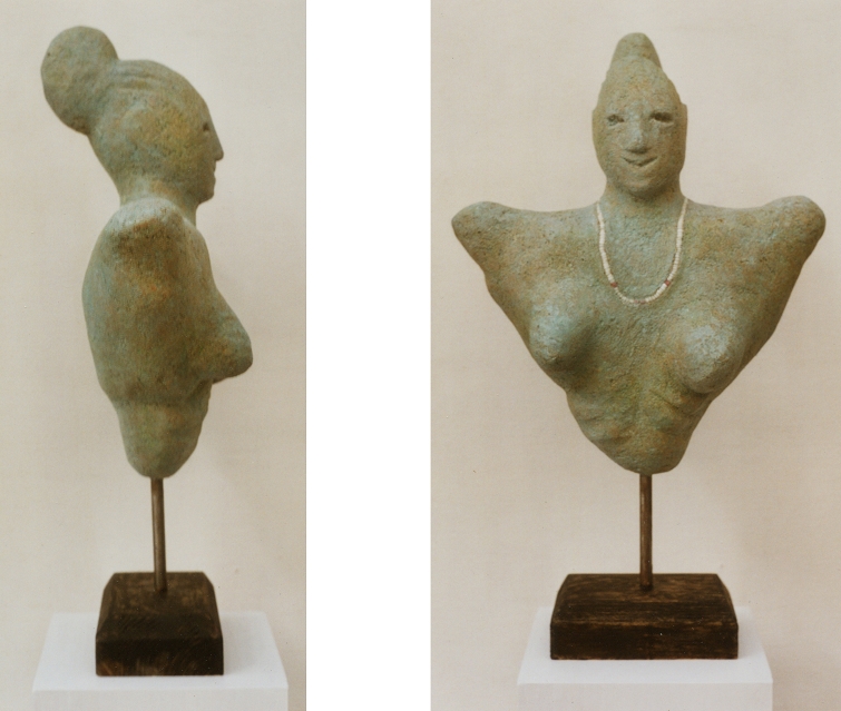 Weibliche Büste (Ansichten) · Steinholz, Holz, Eisen, Ölfarben, Korallenkette · H 66cm B 40cm T 22cm · 2003
