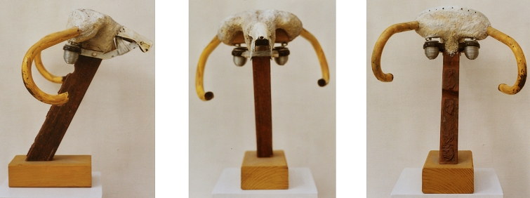 Widderschädel (Ansichten) · Holz, Metalle, Kunststoff, Farben, Steinholz · H 44cm B 37cm T 36cm · 1998