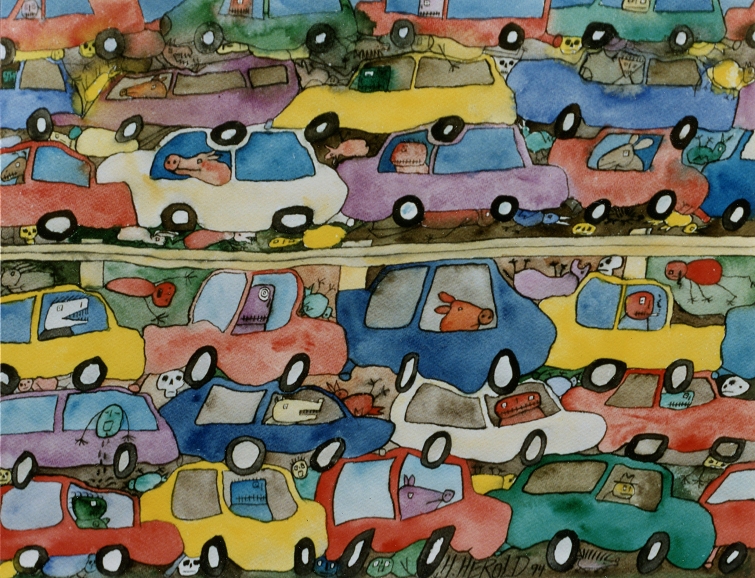 Kleine Stau-Orgie (Nr.1) · Aquarell · 41 x 53 cm · 1994 · Besitz Stadt Mannheim