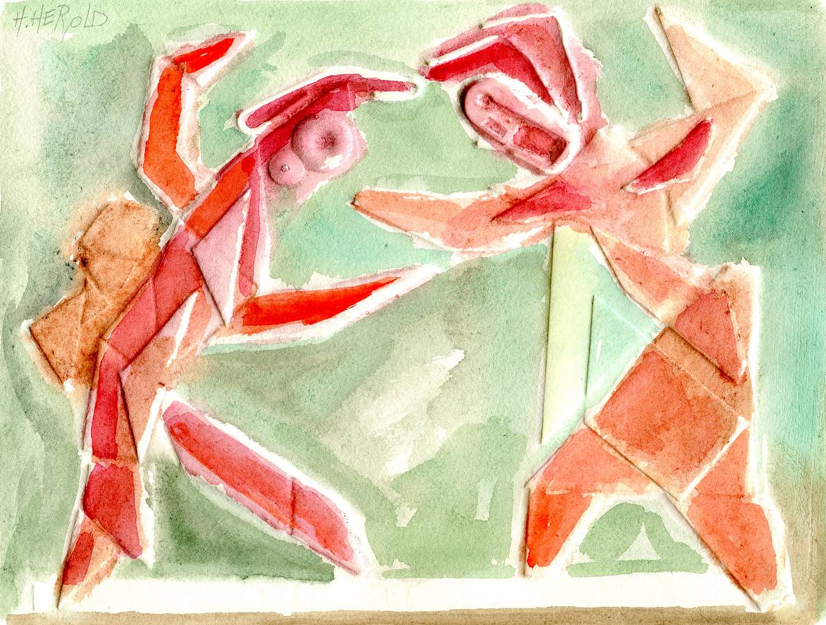 Streitende · Prägedruck, Aquarellfarben · 15,8 x 20,7 cm · 2014