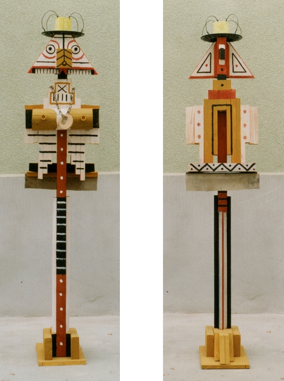 Königin (Ansichten) · Holz, Metall, Kunststoff, Farben, Filz · H 180cm B 38,5cm T 41cm · 1998 · Privatbesitz